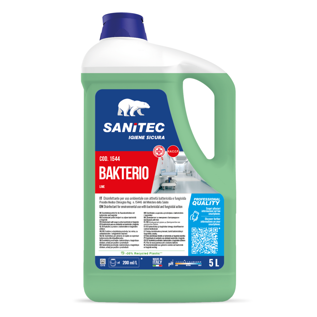 MODALITA' D'USO: BAKTERIO® va usato con un panno o una spugna bagnati nella soluzione per disinfettare, pulire e deodorare ambienti ed oggetti in alberghi, mense, industrie, scuole, case di riposo, ecc. DILUIZIONI D’USO • Per disinfettare e deodorare energicamente bagni, lavelli, pareti, pavimenti, piastrelle, contenitori di raccolta rifiuti, tazze WC ed altre superfici, potenziali fonti di germi, diluire BAKTERIO® in acqua in rapporto al 20% lasciando agire per 15 minuti. • Per l’ordinaria disinfezione e pulizia di bagni, lavelli, pareti, pavimenti, piastrelle, porte, stipiti ed altre superfici lavabili diluire BAKTERIO® in acqua dall’1 al 3% lasciando agire per 5 minuti.