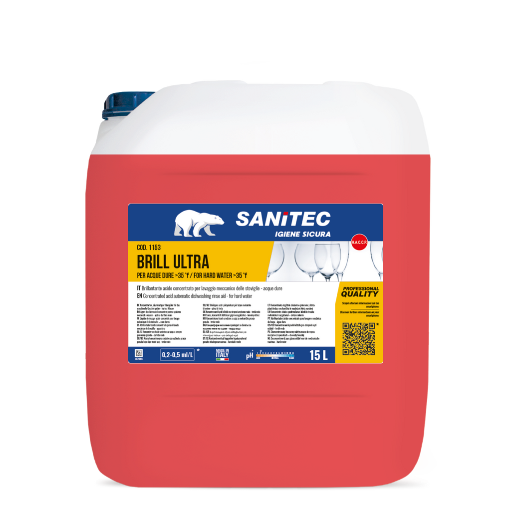 BRILL ULTRA 15LT è un detergente professionale che accelera l'asciugatura delle stoviglie, garantendo risultati impeccabili anche su superfici in plastica. La sua formula a schiuma controllata assicura stoviglie brillanti, prive di aloni e macchie d'acqua. Grazie all’azione neutralizzante, protegge il vetro dai residui caustici, preservandone la trasparenza. Inoltre, elimina efficacemente i cattivi odori, lasciando un ambiente fresco e pulito. Una soluzione completa per una pulizia raffinata e senza compromessi.