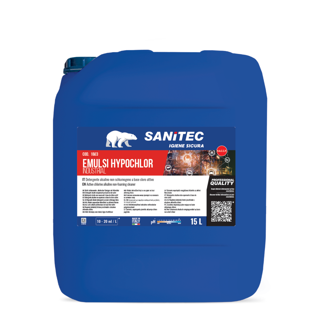 EMULSI HYPOCHLOR 15LT è un detergente alcalino non schiumogeno ad alta concentrazione di ipoclorito, progettato per eliminare efficacemente residui organici e tracce di sangue. La sua formula avanzata rimuove facilmente macchie di origine vegetale e biologica, garantendo una pulizia profonda e sicura. Facile da risciacquare, si adatta perfettamente a sistemi di pulizia automatizzati CIP, immersione e dosaggio a bassa pressione. Ideale per le industrie di lavorazione di carne, pesce, verdure e prodotti agroalimentari, assicura igiene impeccabile con risultati professionali.