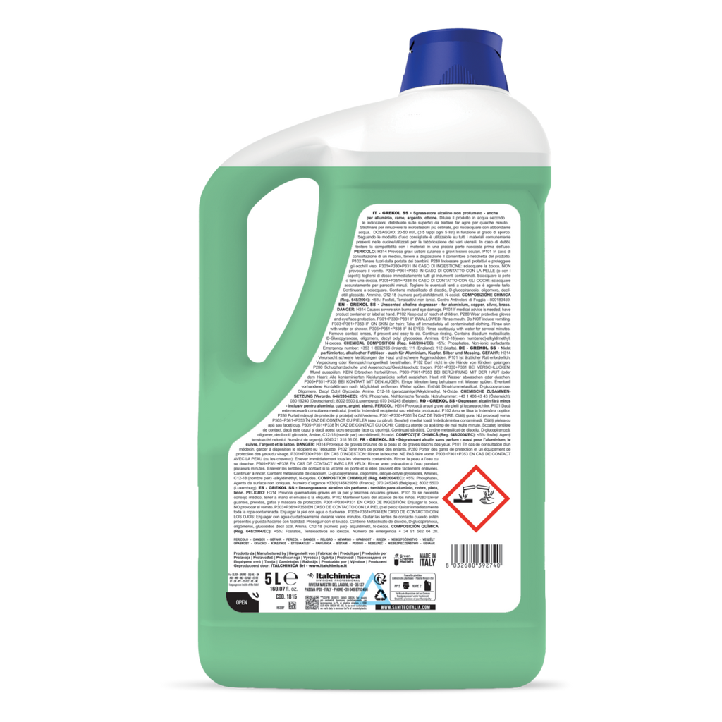 GREKOL SS 5LT è uno sgrassatore concentrato ideale per rimuovere efficacemente ogni tipo di sporco. La sua formula delicata è compatibile con tutte le superfici, inclusi marmo e metalli dolci come alluminio e rame, garantendo una pulizia profonda senza danneggiare i materiali. Privo di profumazione, è perfetto per l'uso in cucina su superfici e attrezzature, assicurando igiene e sicurezza con un tocco di raffinatezza.