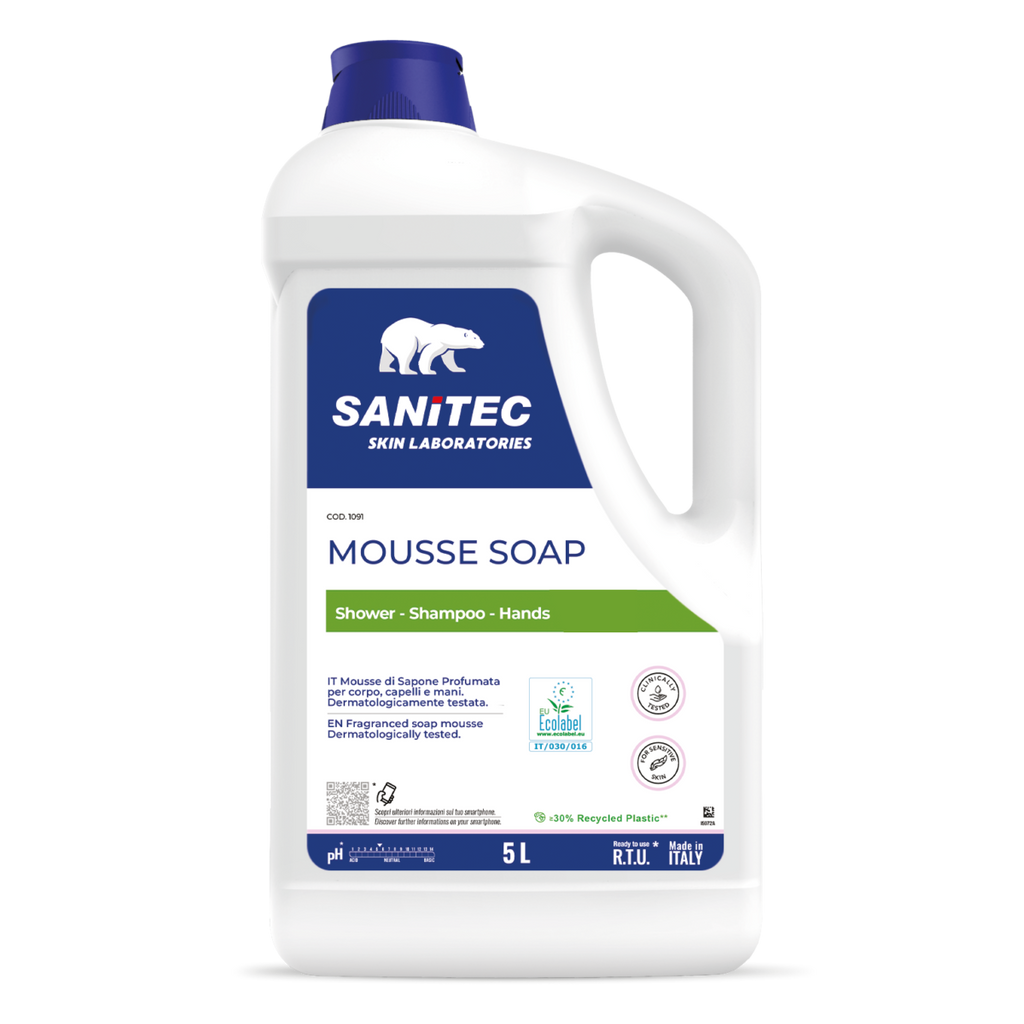MOUSSE SOAP GREEN POWER 5LT è una mousse detergente delicata, ideale per mani, viso e corpo. Dermatologicamente testata, arricchita con agenti idratanti ed emollienti, rispetta il pH naturale della pelle, garantendo una pulizia efficace senza seccare. Certificata EU Ecolabel, assicura un basso impatto ambientale, unendo cura personale e sostenibilità in un unico prodotto di alta qualità.