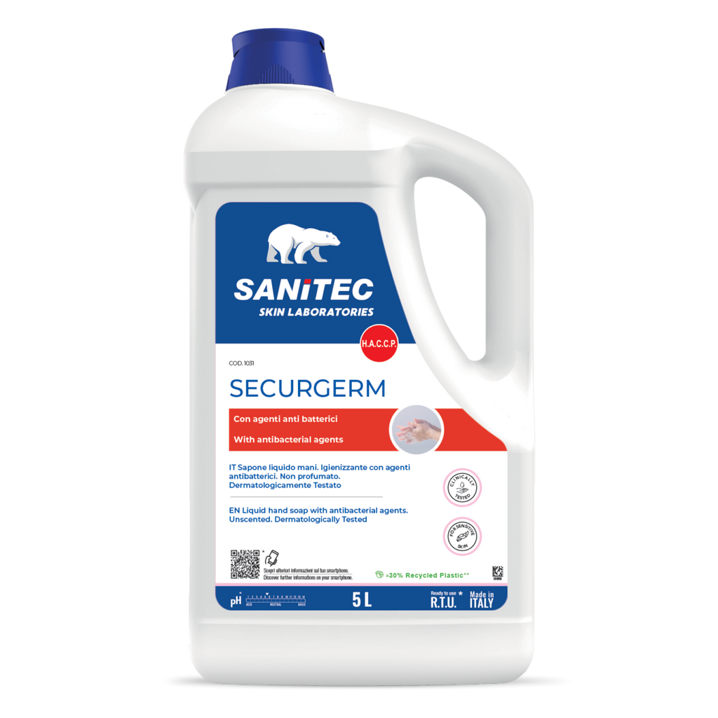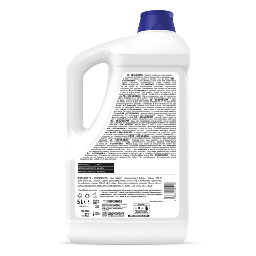 SECURGERM 5LT offre una formula delicata con pH 5.5, ideale per rispettare l’equilibrio naturale della pelle. Senza profumo, è arricchito con due principi attivi antibatterici, Clorexidina e Acido lattico, che garantiscono un’efficace azione igienizzante senza irritare. Perfetto per chi cerca una protezione sicura e raffinata.