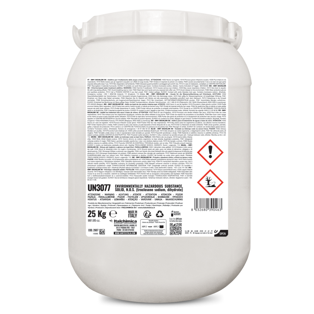 SW DICHLOR 56% 25KG è un prodotto a base di acido isocianurico altamente stabilizzato, progettato per garantire una protezione duratura del cloro nelle piscine. Il rilascio progressivo dello stabilizzante rallenta la decomposizione del cloro fino all’80%, anche in presenza di esposizione solare diretta. La sua dissoluzione avviene tramite una reazione debolmente acida, contribuendo a mantenere stabile il pH ottimale dell’acqua, assicurando così un ambiente balneare equilibrato e sicuro.