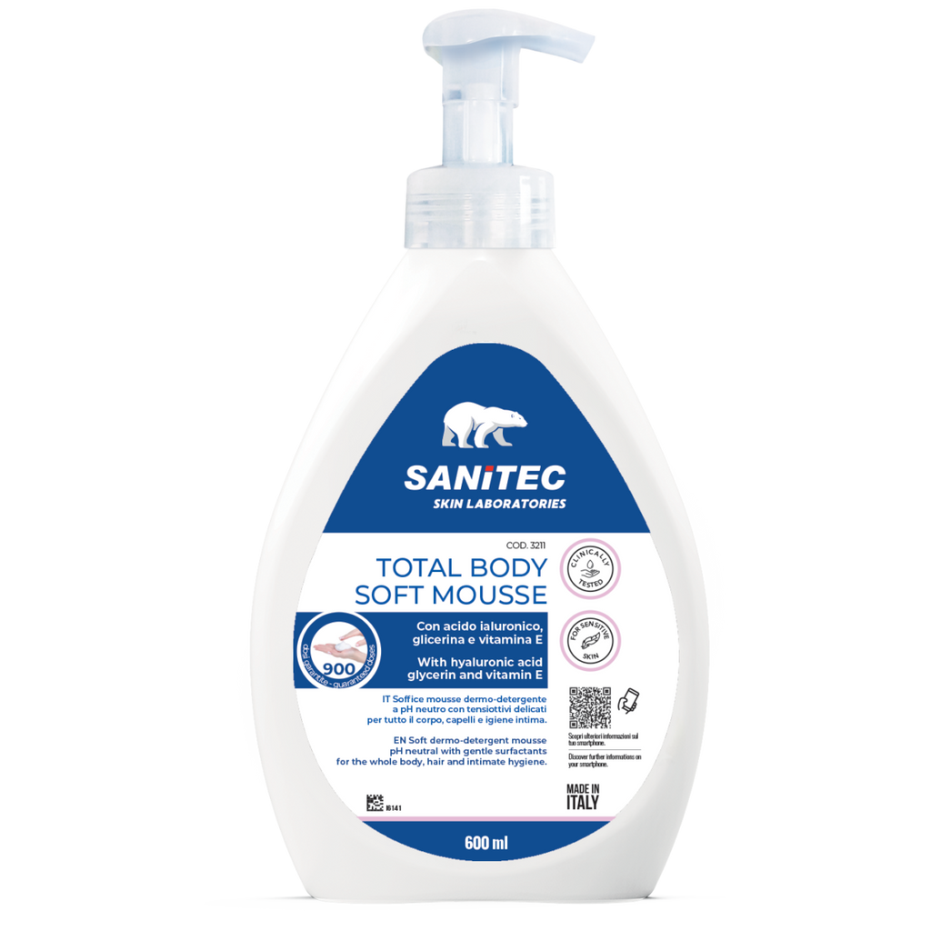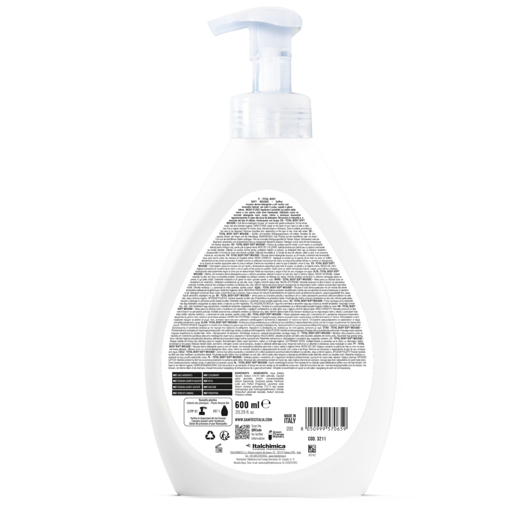 TOTAL BODY SOFT MOUSSE TE' VERDE 600ML combina acido ialuronico, glicerina e vitamina E per una detersione delicata e profonda. Adatto a tutti i tipi di pelle, questo mousse garantisce un'igiene quotidiana completa, ideale anche per la detersione assistita, lasciando la pelle morbida, idratata e protetta.