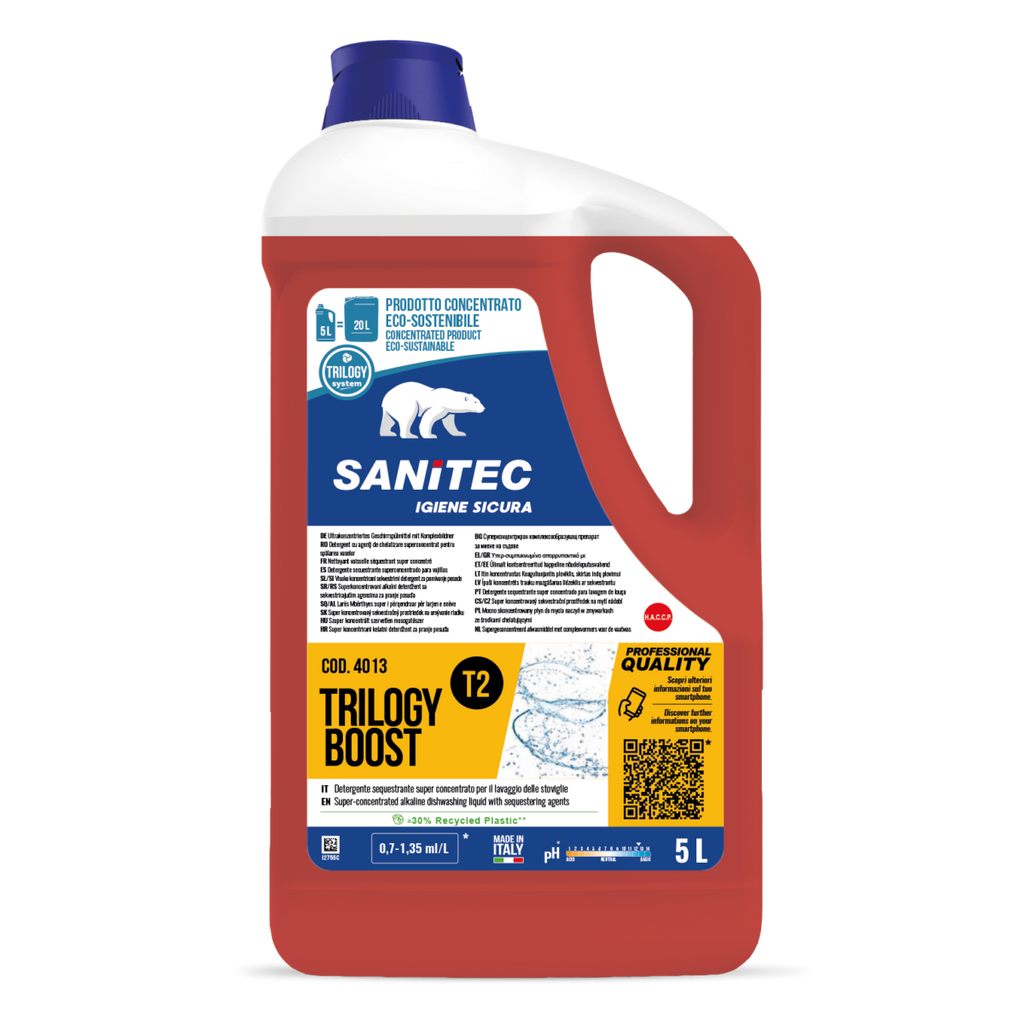 TRILOGY BOOST T2 5LT offre un eccellente potere sequestrante, prevenendo efficacemente la formazione di calcare durante il lavaggio. Progettato per essere utilizzato insieme a Trilogy Wash T1 e Trilogy Rinse T3, consente dosaggi personalizzati in base alla durezza dell’acqua e al livello di sporco. La sua formula priva di fosforo ed EDTA garantisce un impatto ambientale ridotto, mantenendo al contempo alte prestazioni di pulizia. Una soluzione raffinata per risultati impeccabili e una manutenzione ottimale delle superfici.